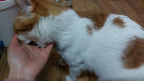 집사 손바닥에 사료가 없음.
