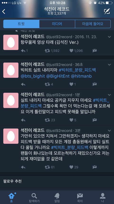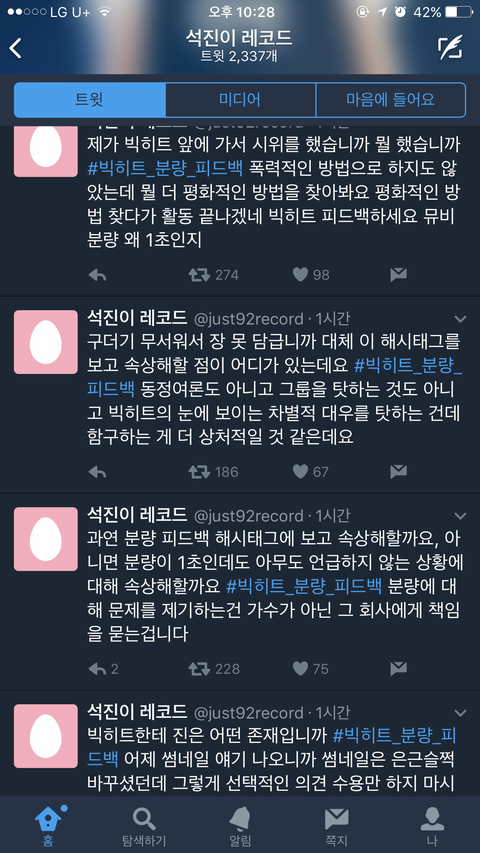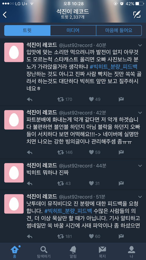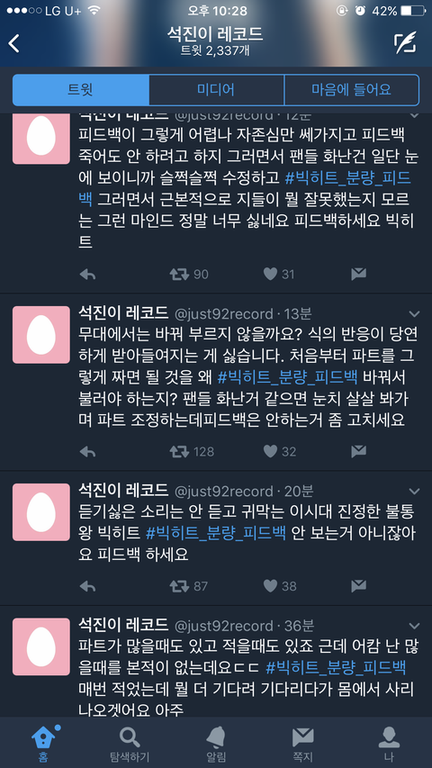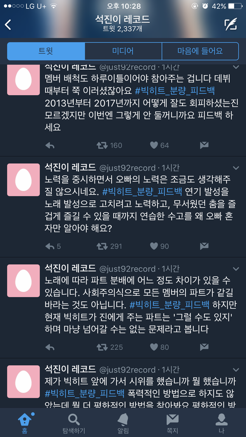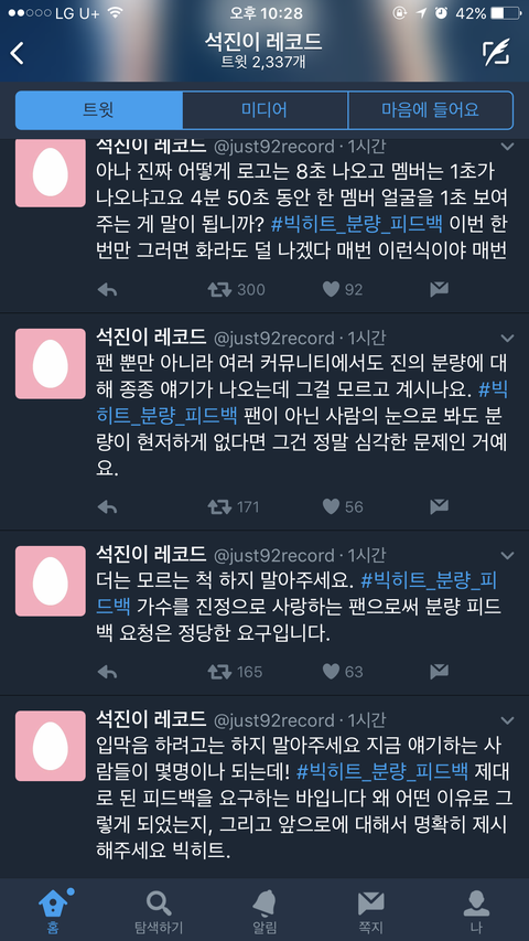 점점 글이 요지를 벗어나는듯 분량문제에 지적하는건 잘하는거일지 몰라도 점점 애가 뭘 못해서 혼자 그렇게 파트를 빼냐 멤버배척아니냐 하면서 글 쓰시는데 참 진짜;;,,,혹시라도 석진이가 볼까무섭다 진짜 말을 왜저렇게 하는지,,,속상한건 알겠는데 말 저렇게 하는거 오히려 석진이만 생각하고있는걸로도 보임 다른멤버들은 생각안하나 저 사람은 어느입장에서보건 속상한건 백번 공감하지만 표현이 잘못되는듯 엄청 많이 올리던데 이거에 두배는 될듯 이게 악개짓이라면 그냥 악개하겠다던데 ㄹㅇ 악개같다 그냥 점점 가면갈수록,,