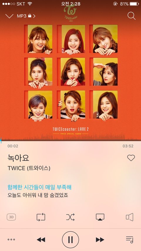 이거 어제 트와이스 신곡 수록곡인데 나도 막 걸그룹노래 즐겨듣고 하는 스타일은 아닌데 이거 노래 진짜 잔잔하고 좋아ㅜㅜ 트와이스목소리도 갠춘한데 난 노래 음자체가 좋아 한번 들어봐!