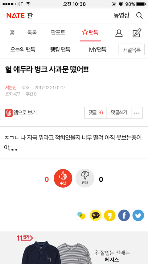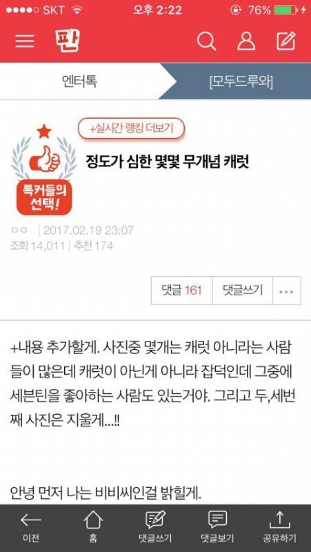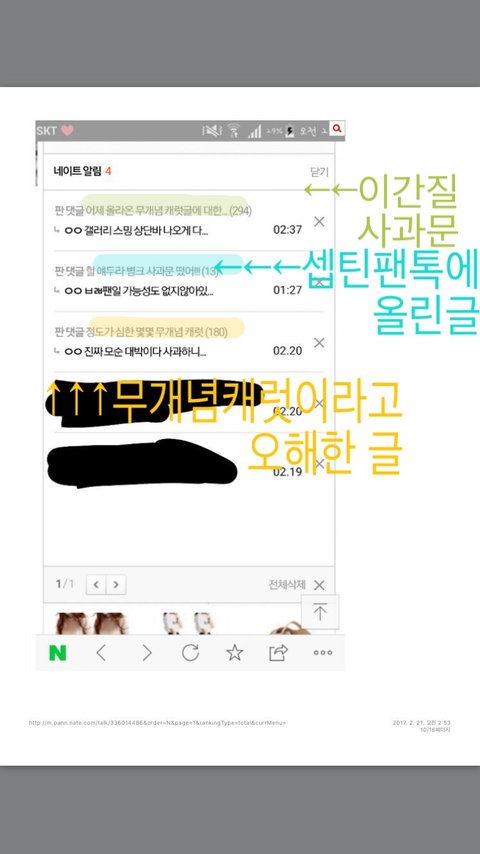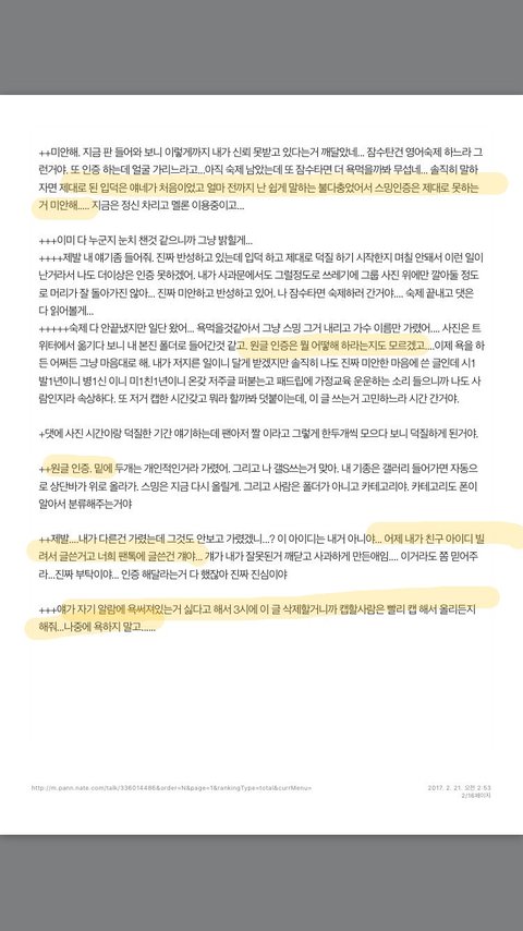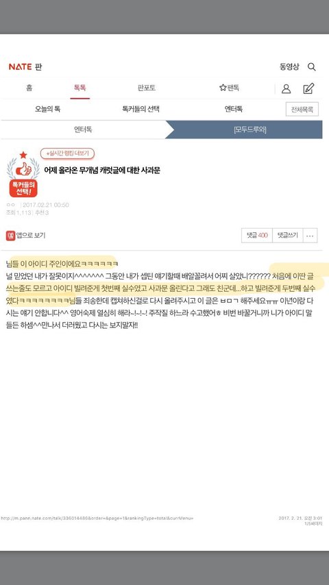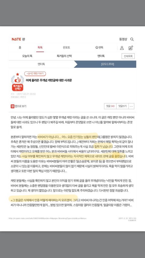 → 새벽 12시 50분 원글쓴이라고 하는 사람의 사과문이 올라옴 (제대로된 타팬,원글쓴이 인증이 없어서 인증을 달라고 댓글들 난리남)