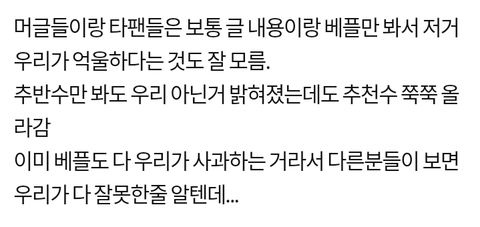 갑자기 폰압이 되서 이제야 상황을 확인했는데 컴을 아주 잠깐 할 시간만 되서 내가 쓴 댓글에 문제가 있는지만 잠깐 보러 들어가서 베플이 된 것만 알고있었고 상황은 아예 몰랐었는데 오늘 다시 폰을 받고 상황파악을 하는데