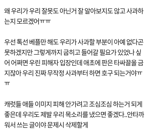 이런 글들이 보이더라고..(이 글을 쓴 캐럿들을 욕하는 게 아니야! 이게 옳은거 잘 알고 전혀 악의없어 캡해서 가져온거 문제되면 바로 말해줘..!) 이 글을 본 후에야 내가 뭘 잘못했는지, 내 행동이 어떤 영향을 미쳤는 지 알게 되었어