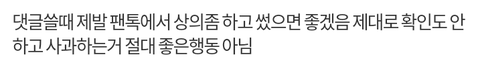 내 경솔한 행동으로 인해서 실추?된 팬덤 이미지나 해결하느라 글 쓰고 해명하고 다닌 캐럿들, 마음 졸였던 캐럿들 모두에게 너무 미안해 앞으로는 조금 더 신중히 팬톡 상황을 보고 글을 쓰도록 할게 너무 미안해..
