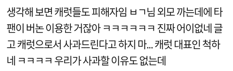 물론 내가 쓴 글 내용에 일부러 팬톡 캐럿들의 잘못이 아니니까 사과하거나 그 사람들을 캐럿으로 칭하지 않고 그 사람들 이라고 칭함과 동시에 캐럿들은 그렇게 생각하지 않는다, 쓴이 놀랐을텐데 걱정하지 말아라 라고 말하긴 했지만 첨부한 사진들에 써있는 말들을 보니까 난 나름 생각해서 한 행동들이지만 충분히 오해를 불러일으킬 수 있겠구나.. 싶어