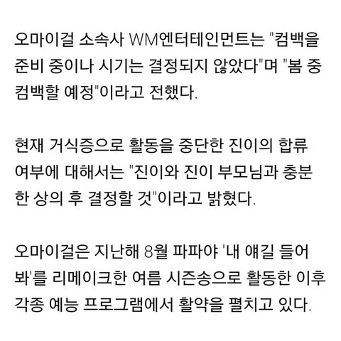 한다고 함 나는 인증 가능한 타여돌 팬인데 이번에 오마이걸 컴백이 중요함 만약에 아픈 멤버 놔두고 컴백한다면 팬들 다 떠날 듯 근데 중요한 건 아직 소속사가 진이의 합류 여부를 정하지도 않고 컴백 준비를 했다는 것임 아마도 소속사가 제대로 미친게 분명하다고 생각이 든다