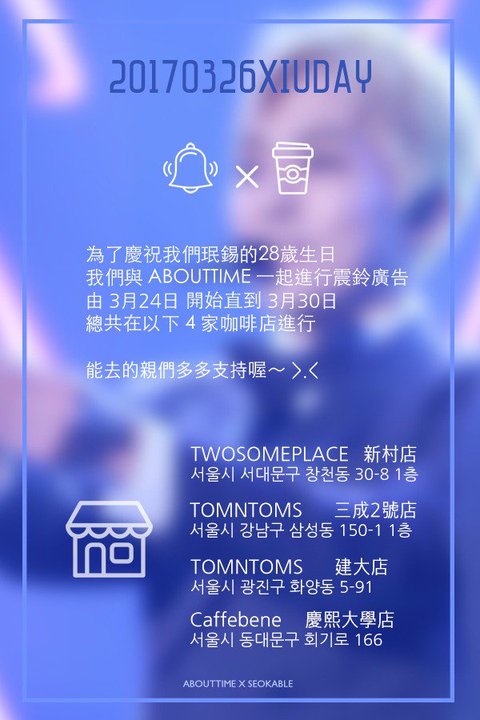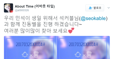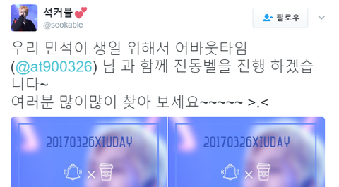 홍콩에서 민석이 열응원하는 홍콩팬페 석커블이랑 어바웃타임님 둘이 같이 투썸,탐탐,카페베네 총 4군데 진동벨로 밍찌생일 축하한대!!ㅋㅋ 커피나 음료 마시러갈때 시기맞춰 달려가서 봐도 좋을거같당>.<