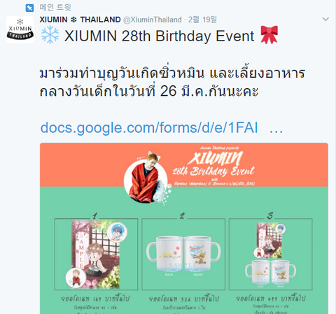 시우민타이랜드(태국팬페중 한곳!!)에서 한국에서도 유명한 태국팬아터 두분과 같이 민석이 생일맞이해서 아픈어린이들을 위한 이벤트를 열기로 했나봐(태국어라 뭐라하는지 모름...ㅠㅠ 번역기 돌려서 봤는데 뭔가를 열어서 그 수익금으로 아픈 어린이들을 위해 쓴다고 하는 것 같음-정확번역아님주의;;)