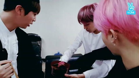지민이가 호석이 옷에 가루 털어주는데