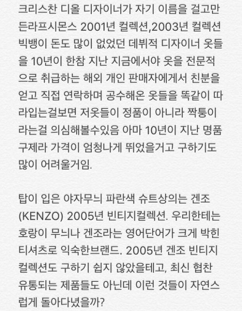 글에서 말한 탑 옷이 이 옷인데 이 옷은 겐조 2005년 빈티지 콜렉션으로 구하기 쉬운 옷이 절대 아니야. 제발 흔하니까 겹칠 수 있다는 말 말아줘.