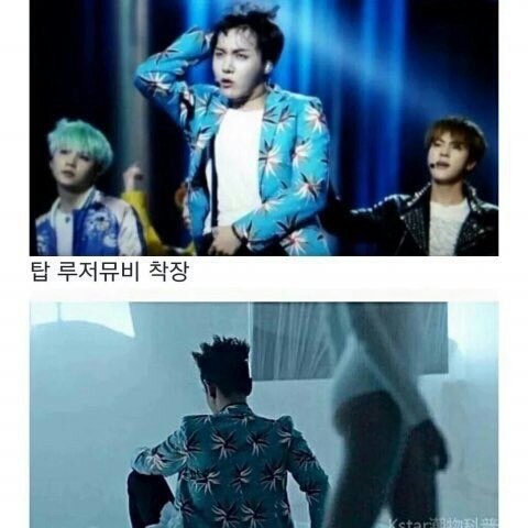 왼쪽사진중 오른쪽 권지용은 2013년 무한도전 가요제 때 했던 머리고 왼쪽 방탄소년단 멤버는 불타오르네 때였던 것 같아.