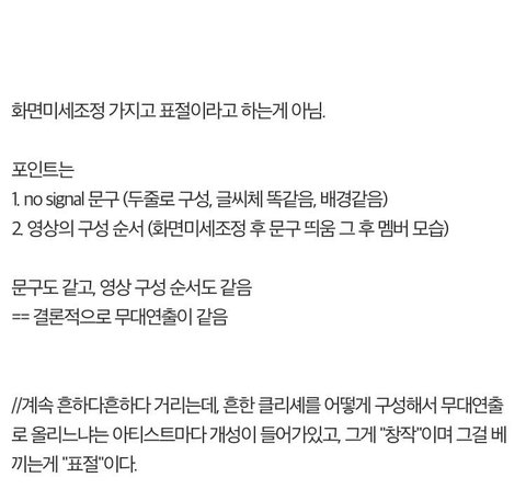 이번 노 시그널도 탑이 그 무대에 엄청 신경써서 여러번 수정도 하고 고쳐가면서 준비했던 무대야. 탑도 이 노 시그널을 엄청 마음에 들어해서 캡쳐해서 인스타에도 올리고 그랬는데 빅뱅을 존경하고 굉장히 팬이라던 방탄소년단이 이걸 모를 리가 없어 또 이 무대를 직접 보기도 했다는 말도 있고 말이야. 그리고 관리자 측에서 무대를 계획했다고들 하는데 자기 무대 한 번도 검토 안 해보고 무대에 오르는 가수가 어디있어... 정말로 빅뱅을 존경해 왔고 팬이었다면 이런 일은 벌어지지 않았을 거라고 믿어. 또, 방탄소년단이라고 죽어라 까는 게 아니라 방탄소년단이 아닌 다른 가수다 이렇게 지속적으로 똑같은 헤어, 비슷한 옷과 코디, 선글라스, 뮤비 마저 비슷했으면 결과는 같았을거야. 제발 꼼꼼히 읽어줘.