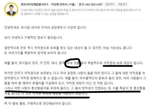 무대 연출이 저작권의 보호를 받지 않는다는 소리는 하지 말아주셨으면 합니다.