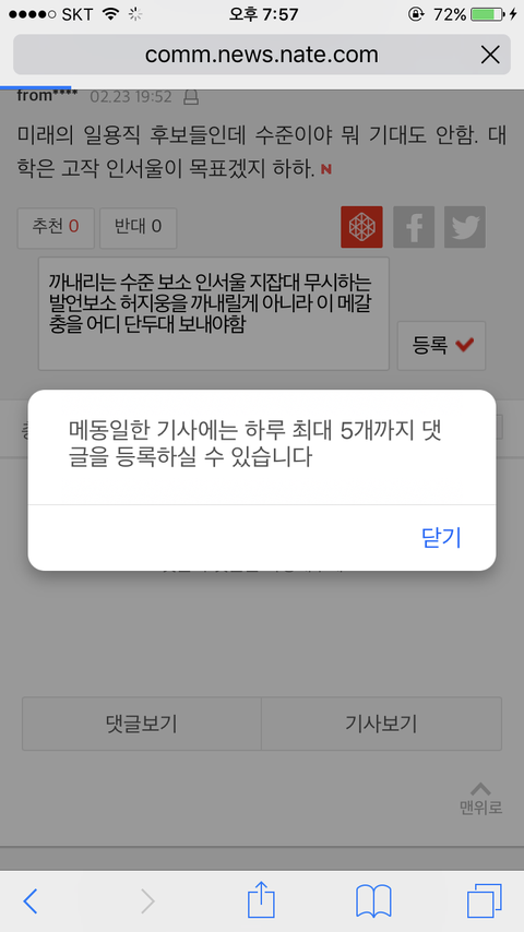 달았는데 네이트 기사는 다섯개 밖에 못쓴대 그거 모르고 기분더러운 댓 답댓만 조카게 달았네