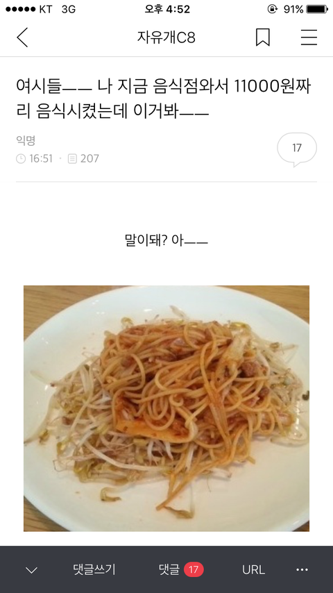 여초에 올라온 박찬열 김치 아라비아따.jpg