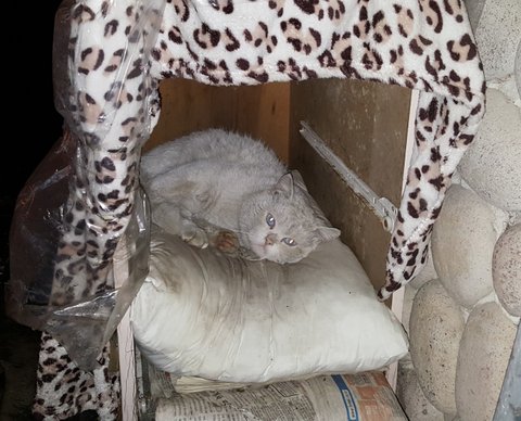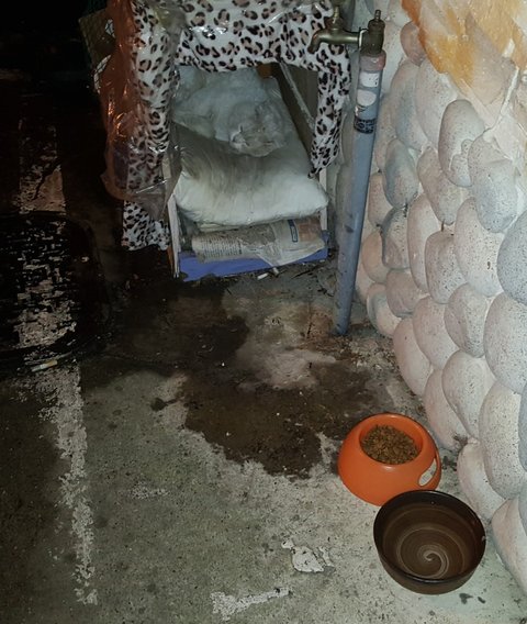 누군가가 빌라 입구에 겨울집을 만들어 놓고 사료그릇과 물그릇을 놓아 두었습니다.