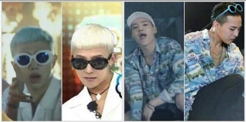 왼쪽사진중 오른쪽 권지용은 2013년 무한도전 가요제 때 했던 머리고 왼쪽 방탄소년단 멤버는 불타오르네 때였던 것 같아.