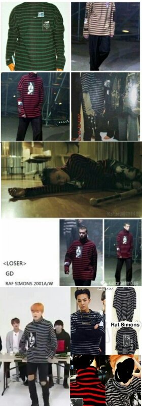 그리고 가장 아래 왼쪽에 입고 있는 옷은 라프 시몬주에서 만든 적 없는 긴팔 검정 줄무늬야. 권지용은 아래 긴 검정 티를 받쳐 입고 그위에 반팔 줄무늬를 입은 거고