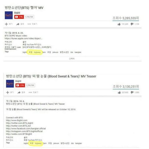 이건 방탄소년단 쩔어랑 피땀눈물 뮤비에 빅뱅이 태그 돼 있는거야 도움 준 사람들이나 그런 것 같은데 빅뱅이 방탄소년단 노래나 뮤비 제작에 도움을 줬다는 말은 한 번도 들어본 적 없는 말이라..