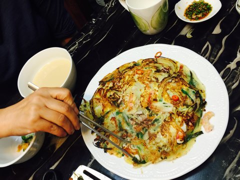 막걸리 한잔 하기 좋은 해물파전 입니다~ 아버지께서 텔레비전을 보시다가 갑자기 나가셔서 다양한 해물들을 사오시더니, 주방에 딱! 놓고 가셨어요ㅎㅎ 알고보니 텔레비전 프로그램에서 부침개를 먹는 장면들을 보셨더라구요~ 만드는건 제 몫!! 맛있게 드셔주셔서 행복했어요+..+