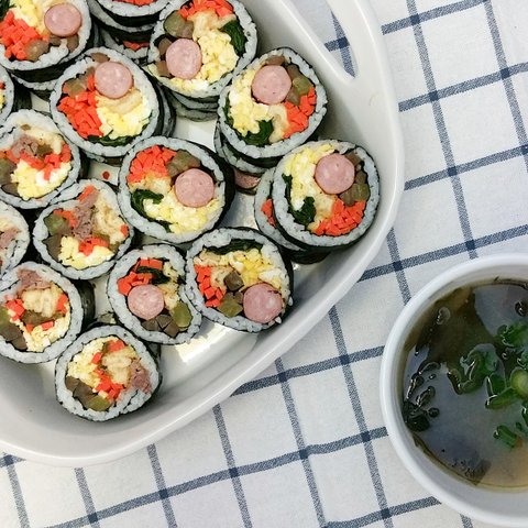 손이 많이 가 잘 만들지 않는 김밥. 모녀 외출할일이있어 남편 저녁으로 말아두고 나갔어요 ㅎㅎ 사실 신생아 아들 아기띠 두르고 먹기 힘들어 간단히 집어먹을 수 있는걸 만들었네요~~ 소세지 김밥은 요리조리 솜씨 좋으신분들 눈팅해가며 배운거에요.