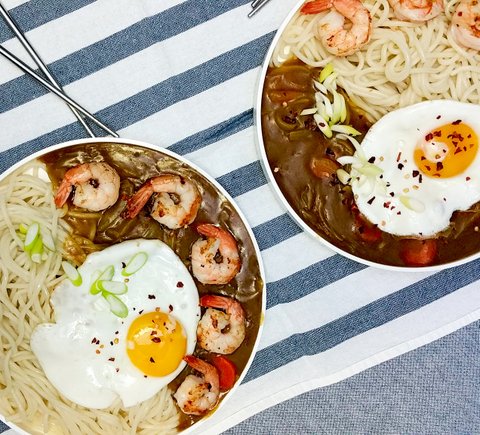 카레면. 원래는 짜장면을 만드려 했으나.. 집에 춘장이 없네요. 꿩대신 닭이라고 카레에 비벼먹어요. 밥에 먹을땐 감자 고기 당근 듬뿍 들어가지만..면엔 거슬리니 양파만 넣어요~ 그리고 카레가루 뿌려 구운 새우 올리면 은근 궁합이 잘 맞아요!