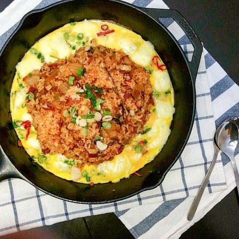 우주선 김치볶음밥. 엄마가 김장김치를 새로 담궈주셔서 신김치 넣을대가 없어요.. 그냥 냉장고에서 쉬어버리기 전에 처치용으로 만들었어요. 전날 먹은 수육 (네 수육을 남기는 대죄를..) 넣어 고소한 김볶!