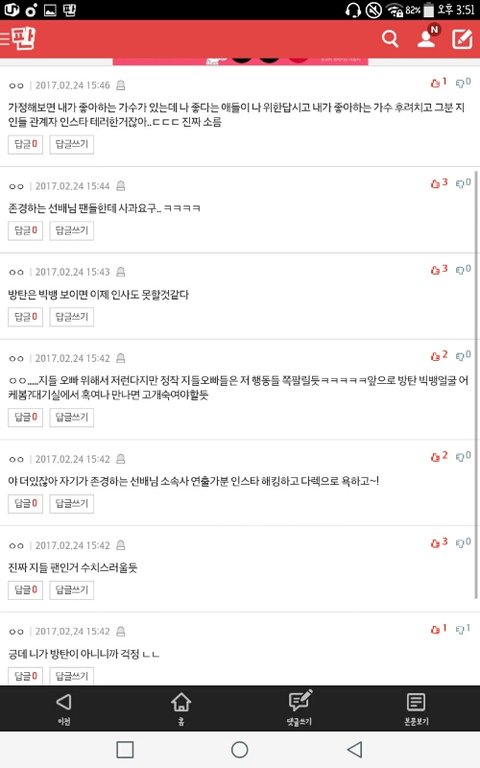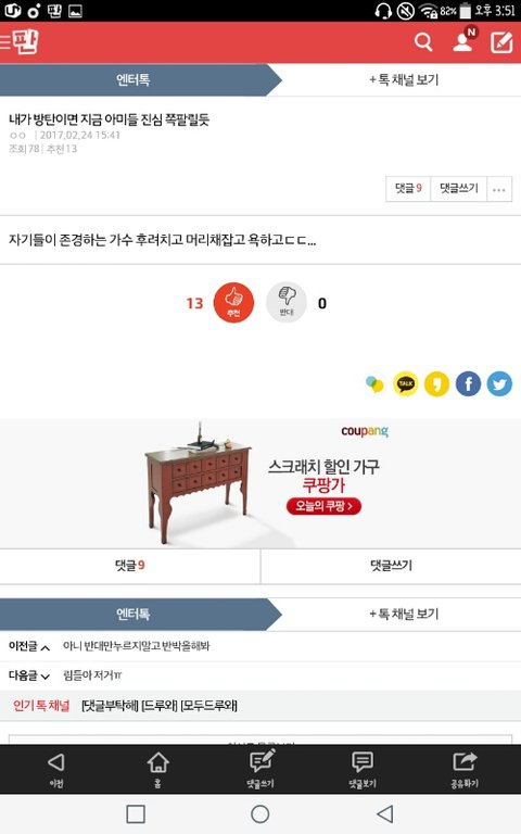 애들이 가수를 존경하는거지 가수의 팬덤을 존경하냐 ㅋㅋㅋㅋㅋㅋ팬덤 대 팬덤으로 하는건데 뭔 논리야 ㅋㅋㅋㅋㅋ지들도 직멘에 실트 올렸으면서 안한척 오지네 개빡친다 ㅋㅋㅋㅌㅌㅋㅌㅌㅌ
