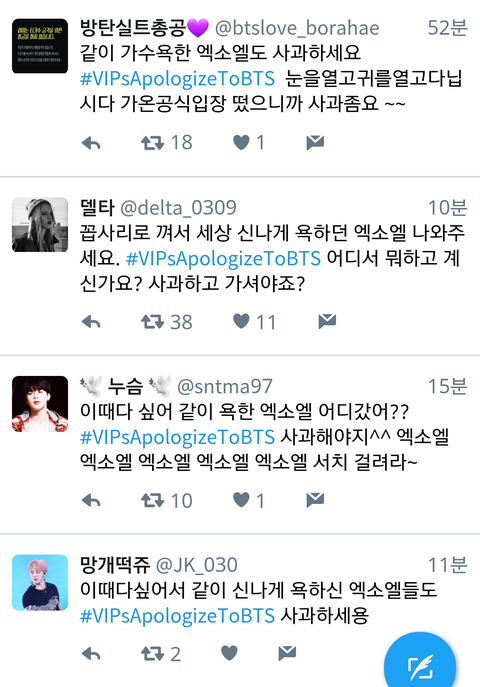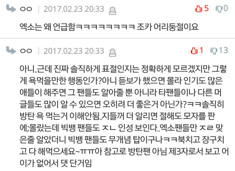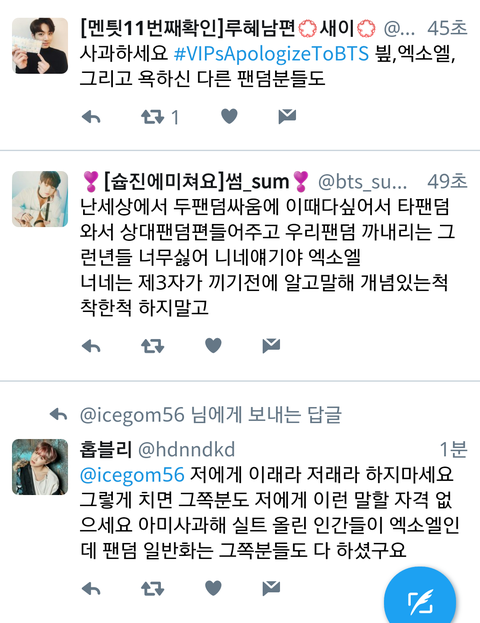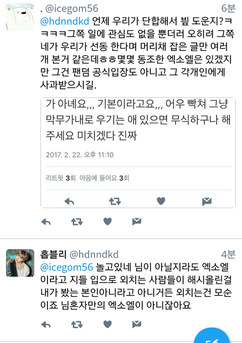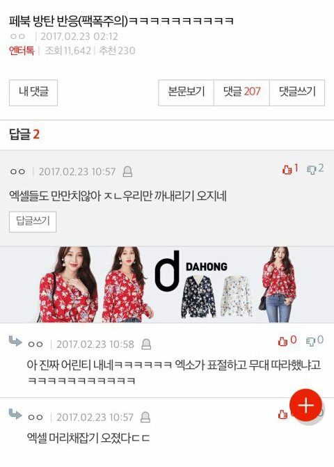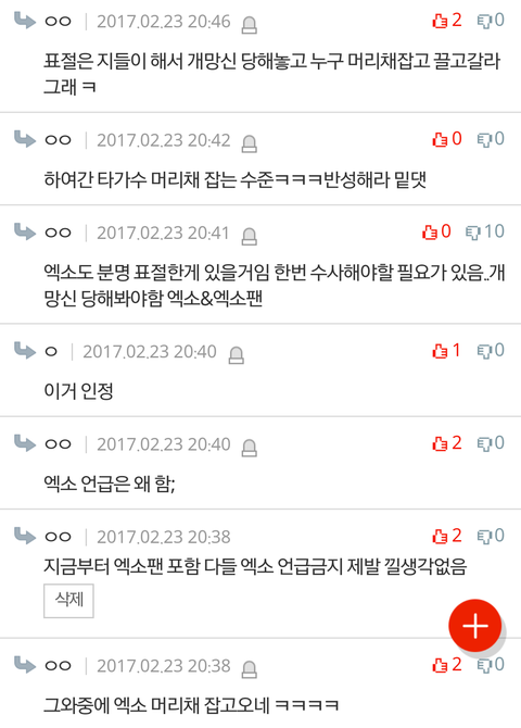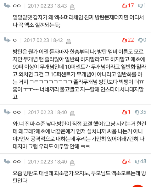 사진 제한때매 더있는데 귀찮기도해서 안올림 나는 쟤네가 우리 머리채잡을때 저 댓 계속 보고있었는데 한 둘도 아니였고 팬코로 보이지도 않았음 그리고 반대폭탄 먹더니 아침에 댓삭했더라 ㅋㅋㅋㅋㅋㅋ ㅅㅁㅇㅈ댓에함