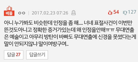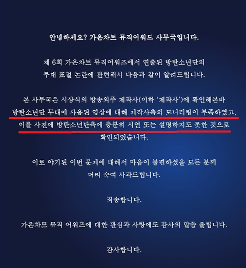 현재 빅히트 관계자측에서 무대 연출과는 관련이 없다고 명백히 밝히고 가온측에서 위에 나왔듯이 피드백을 낸 가운데서 계속 이 부분을 갖고 왜곡된 논란을 추가적으로 생성을 하면 이 내용 또한 빅히트측에게 어김없이 보낼 예정임을 알려드립니다.