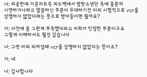 보다시피 리허설 때 VCR를 아예 상영도 하지 않았기에, 방탄소년단은 VCR 영상을 사전에 확인할 방도도 없었습니다. 이 답변 하나로도 모든게 충분히 이해가 가실 거라 믿습니다.