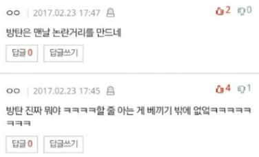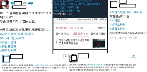 추가적으로 빅히트측에서 이러한 행태를 묵인하지 않고 선처 없이 엄중하게 법적 대응을 할 것으로 발표했기에, 방탄소년단 팬톡측은 지금까지 악의적인 의도를 가지고 방탄소년단에 대해 왜곡된 비난을 한 내용을 모두 자료화하여 보낼 예정입니다.
