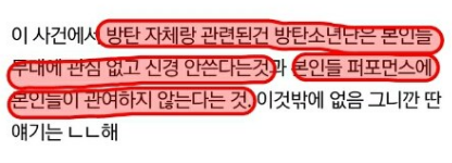 저희는 이 글을 통해 방탄소년단 및 빅히트 소속사는 논란 해당 영상에 대한 일체의 잘못이 없음을 여러분께서 다시 한번 알아주시기 바라며 무분별한 비난을 가한 다수 무개념팬분들과 네티즌들에게 사과를 요청하는 바입니다.