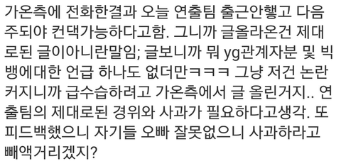 그리고 이 해명글과는 별개로, 어제 와이지 관계자분의 SNS계정에 저희 팬덤의 일부가 댓글과 다이렉트 메세지로 무차별한 발언과 악성 댓글로 도배를 해서 결국 관계자분께서는 계정을 삭제하셨다고 들었습니다. 와이지 관계자분께서도 피해자이신 상황 속에서 어리석은 행동을 한 이들과 같은 팬덤으로서 죄송하다는 말씀을 꼭 드리고 싶습니다. 마음 상하셨을 관계자분과 와이지 팬분들께 진심으로 고개 숙이며 사과드립니다.