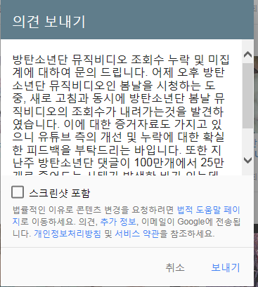 뜬금없긴한데 난 조회수 누락문제도 해결해야될것같ㅇ아서 지금 이렇게 보낼거거든 ㅇㅇ저번에 댓글 삭제된것도 같이 문의하려고 하는데 의견보내기로 보내는거맞지?