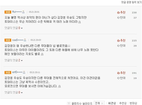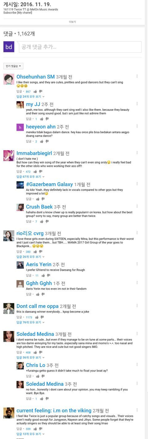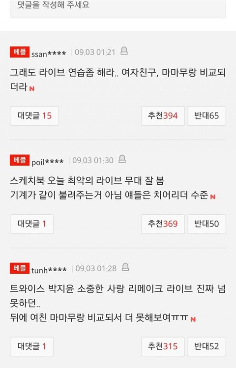 근데.멤버가 거의 고르게 실력이 늘지않는이상 이런 악플은 감수해야하지않을까 조작도아니구 외모나 인신공격글도 아니고 본업일에대한 안좋은글이니까 팬들도 너무 우리애들컴백했네 판까흥 이런댓글들 안쓰는게되려좋지않을까