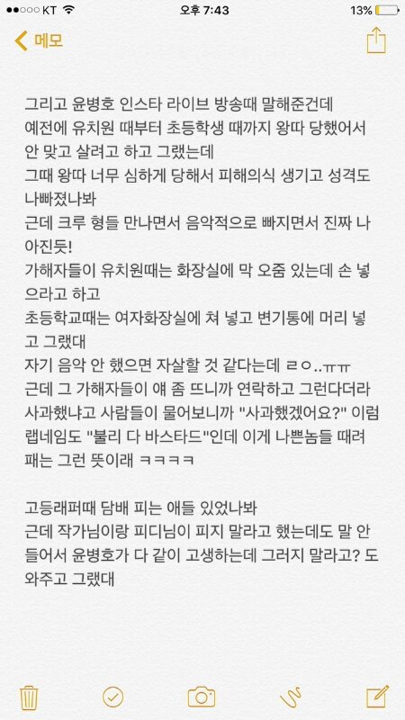 ㄴ나도 퍼왔는데 다들 한번씩 읽으면 좋을것같애ㅠ 가사에 왕따얘기있길래 왕따당한적 있나 하긴했는데.... 랩 잘해서 좋아