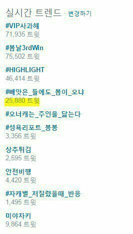 그 후 '빼앗은 들에도 봄이 오냐'라는 실트 올리셨어요. 그 후 저희는 'VIP사과해'와 '역사를 잊은 민족에게 미래는 없다'라는 실트 올렸구요. ..25.500건 이상의 실트수와 '방탄소년단 무대 표절'이라는 실검이 얼마나 큰 상처와 낙인이 되는지 아시나요??