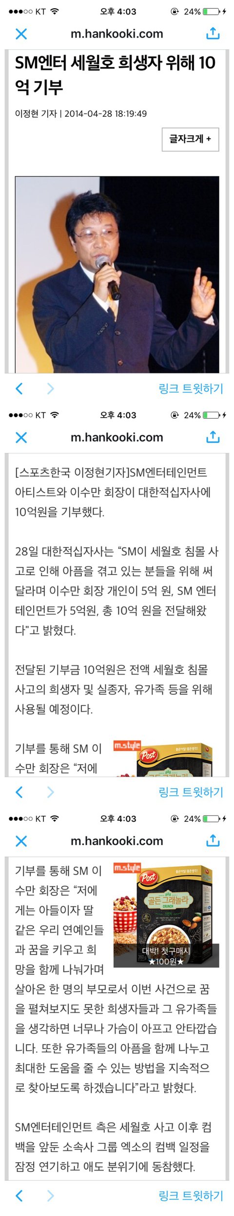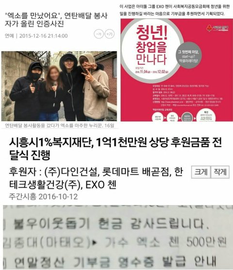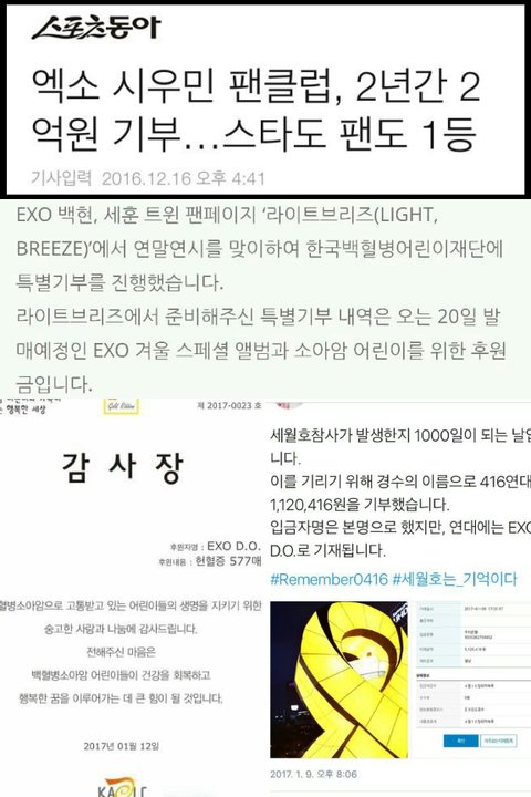 ++++++++와 추천수가 1900개가 넘어가다니...많은 분들이 봐주셔서 넘 감사할따름ㅠㅠㅠㅠㅠㅠ 댓글에 간간히 이런글에 반대가 왜 100개씩이나 있지? 라고 생각해주신것만으로도 저는 제 본분을 다한거같습니다.... 엑소가 이만큼이나 착한일을 했어! 가 아니라 연예인의 선행을 통해 팬들도 따라 선행을 하는 문화가 퍼졌으면 하는 의도에서 쓴 글이니까요 너무 꼬아서 보지만 말아주세요 글 읽어주신 분들 감사합니다!