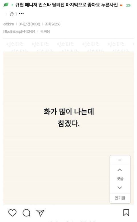 조카 규현 콘서트때문에 외국 나가있단말이야. 규현이 묵고 있는 호텔에서 불이 났는데 회사사람들, 매니저들끼리만 먼저 대피하고 스벅가서 커피쳐마시는 동안 규현은 호텔에서 공연 멘트 정리하고있었다 ㅋ? 지들끼리만 대피하는게 말이되냐? 규현은 모르고 있다가 그연기 안에서 자서 성대에 주사맞고 콘서트 했어. 광화문에서 부르다가 팬들한테 미안해서 울고. 조카 빡치는건 스텝 지들끼리 스벅가서 인스타에 올리고 지랄한거 ㅋ 태그달시간은 있고 규현데리고 올시간은 없었나봐?