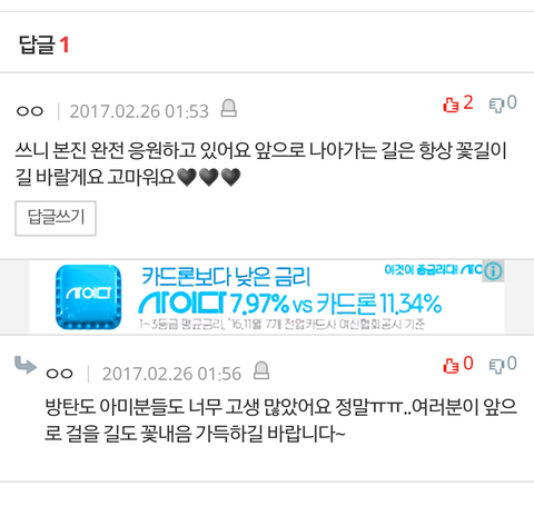 밑에 타팬분이 올리신 글에 이삐 중 한 명이 댓글 달았더니 타팬분께서 다시 올리신 대댓글인데 울컥함..