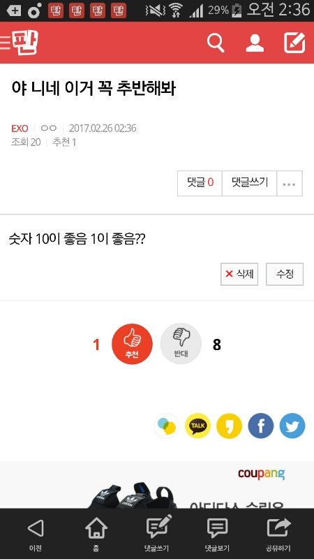 반대를 누르신 분들은 다음 콘서트에서 등번호가 01인 멤버 즉 리더님과 아이컨택을 합니다 추천을 누르신 분은 다음 콘서트에서 등번호가 10인 멤버 즉 장사장님과 아이컨택을 합니다