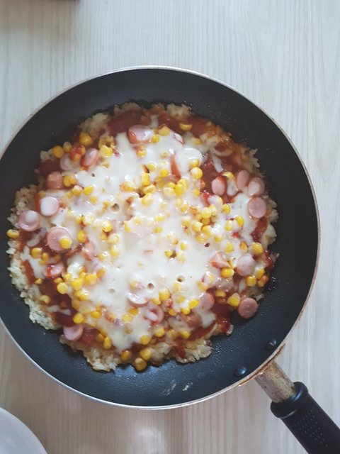 동생이 밥피자를 정말 좋아해서 고추참치에 햄 옥수수콘 치즈 등등 넣고 휘리릭 해줘요. 고추참치가 느끼함을 잡아 준답니다.