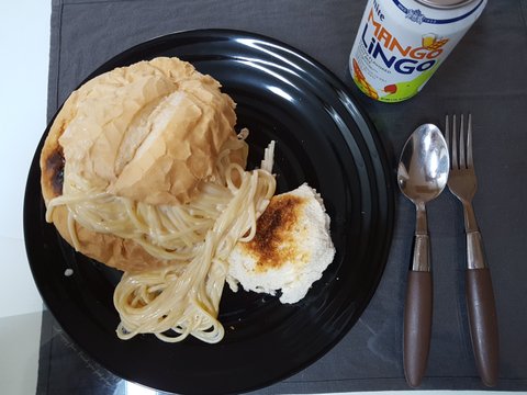 빠네가 먹고싶은데 밤10시라 난감해서 시판까르보나라소스에 파스타 대강하고 빠네 비스무리한 동그란 빵이 마침 놀고있어 팬에 살짝 바삭히 구워다 야매로 빠네했어요.