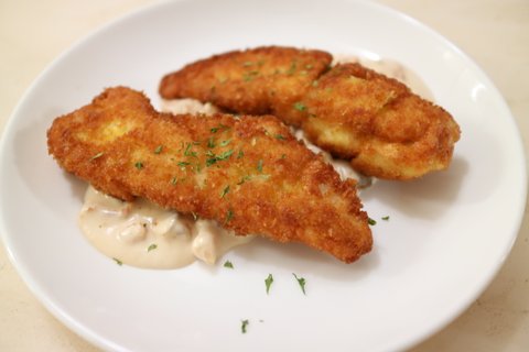 닭가슴살 두덩이가 있길래 밀가루-계란-빵가루 순으로 튀겨준후 생크림,양송이와 칵테일 새우 다진것,우유 를 끓이고 졸여 소스를 만들어 찍어 먹었어요. 맛있어요!