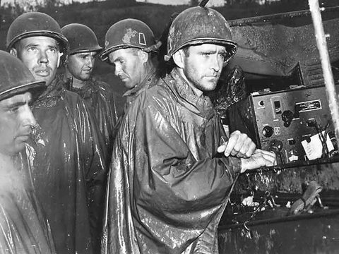 설명 : 오키나와 전선에서 독일 항복 방송을 듣는 미군들
