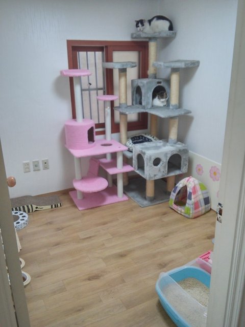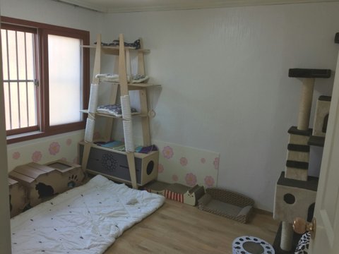 2층 주택에 15마리 정도 냥이들이 쉼터에서 케어받으며 지내고 있는데