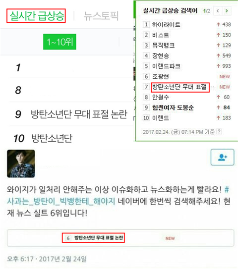 2. 대중들이 많이 접하는 네이버 실시간 검색어, 연관검색어에 ‘방탄소년단 무대 표절 논란’이 뜨게 되어 잘못이 없음에도 불구하고 방탄소년단은 수많은 비난을 받음+더 굳어진 표절 꼬리표