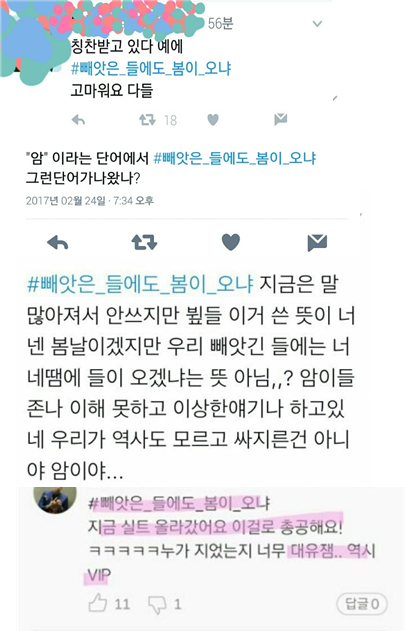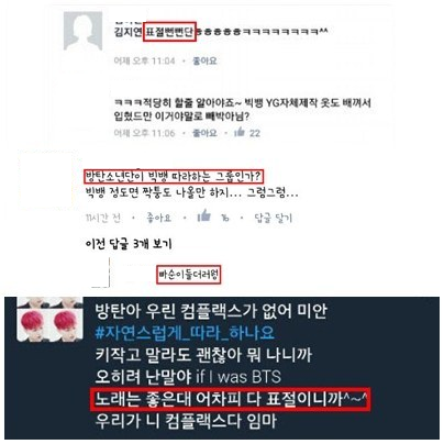 3.방탄소년단에게 트위터 직멘으로 심한 욕설과 비난을 보내며 직접적으로 ‘표절논란’을 들이댐+일제 강점기에 쓰여진 시를 방탄소년단 타이틀곡 제목과 연관지어 비꼰 실트를 올림