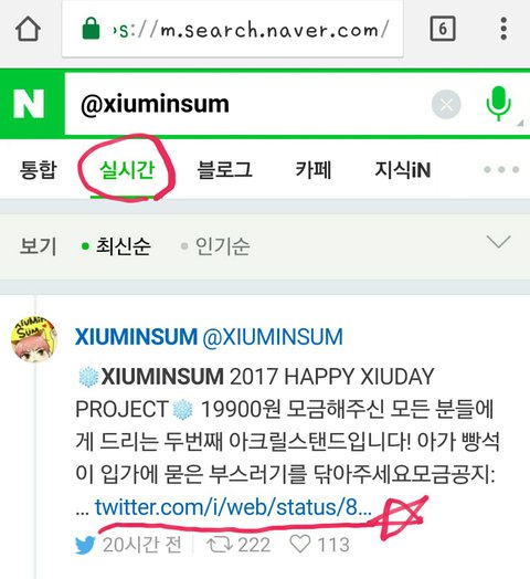 트위터 안하는 웅녀들은 네이버에 @xiuminsum 실시간 검색 누르면 이화면 나오는데 밑줄친 링크 클릭하면 트위터 아이디 없어도 볼수있어!