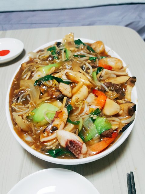 각종 해산물과 채소,고기를 볶다가 전분물을 풀은 유산슬